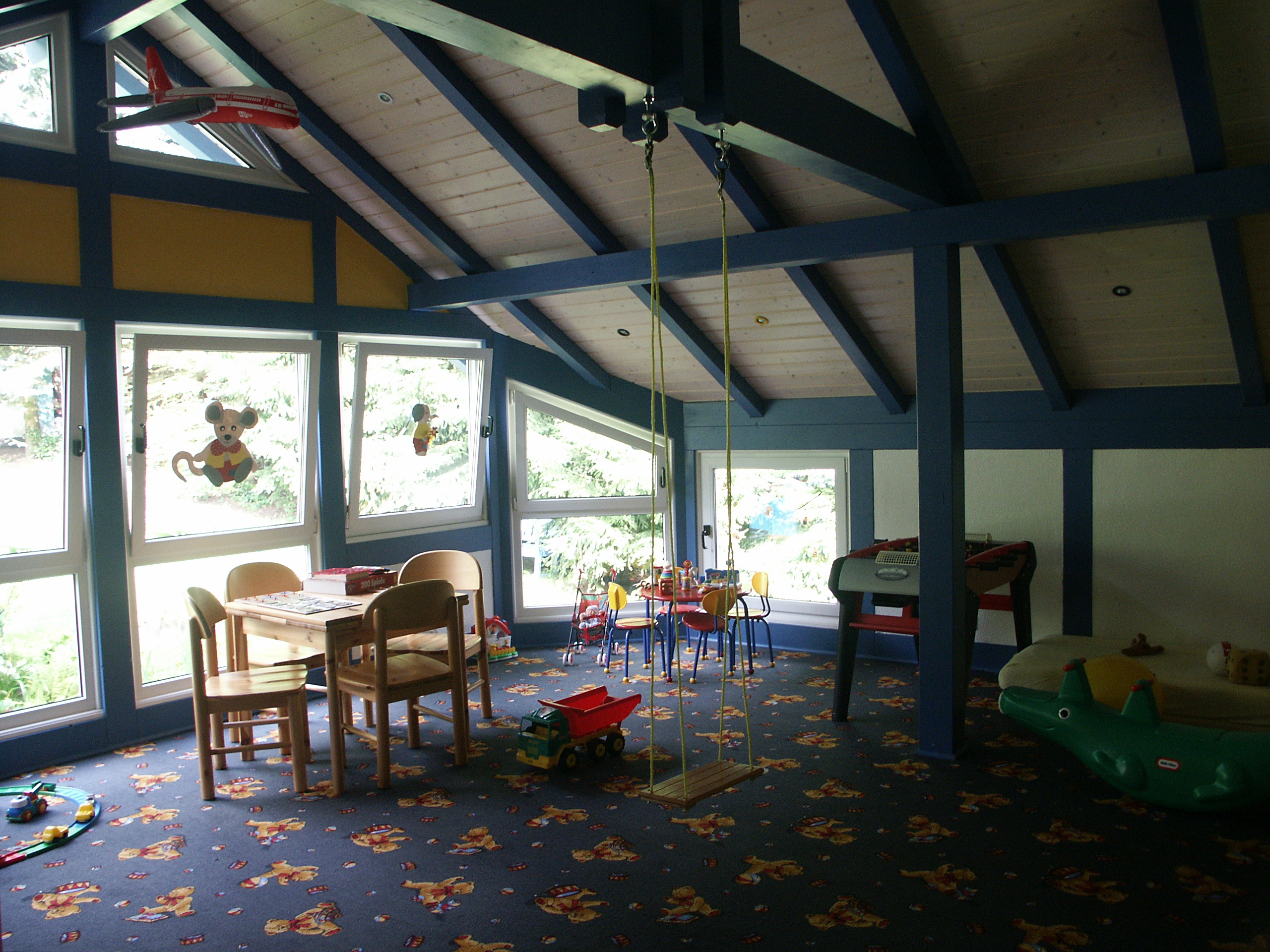 Der Traum der Kinder: im 40qm großen Spielzimmer finden die Kinder alles für einen kurzweiligen Tag: Schaukel, Rutsche, Küche, Kuschelecke, Bobbycar, Autos, Kicker, viele Spiele, alles zum Malen… Im Fitnessraum gibt es eine Tischtennisplatte.